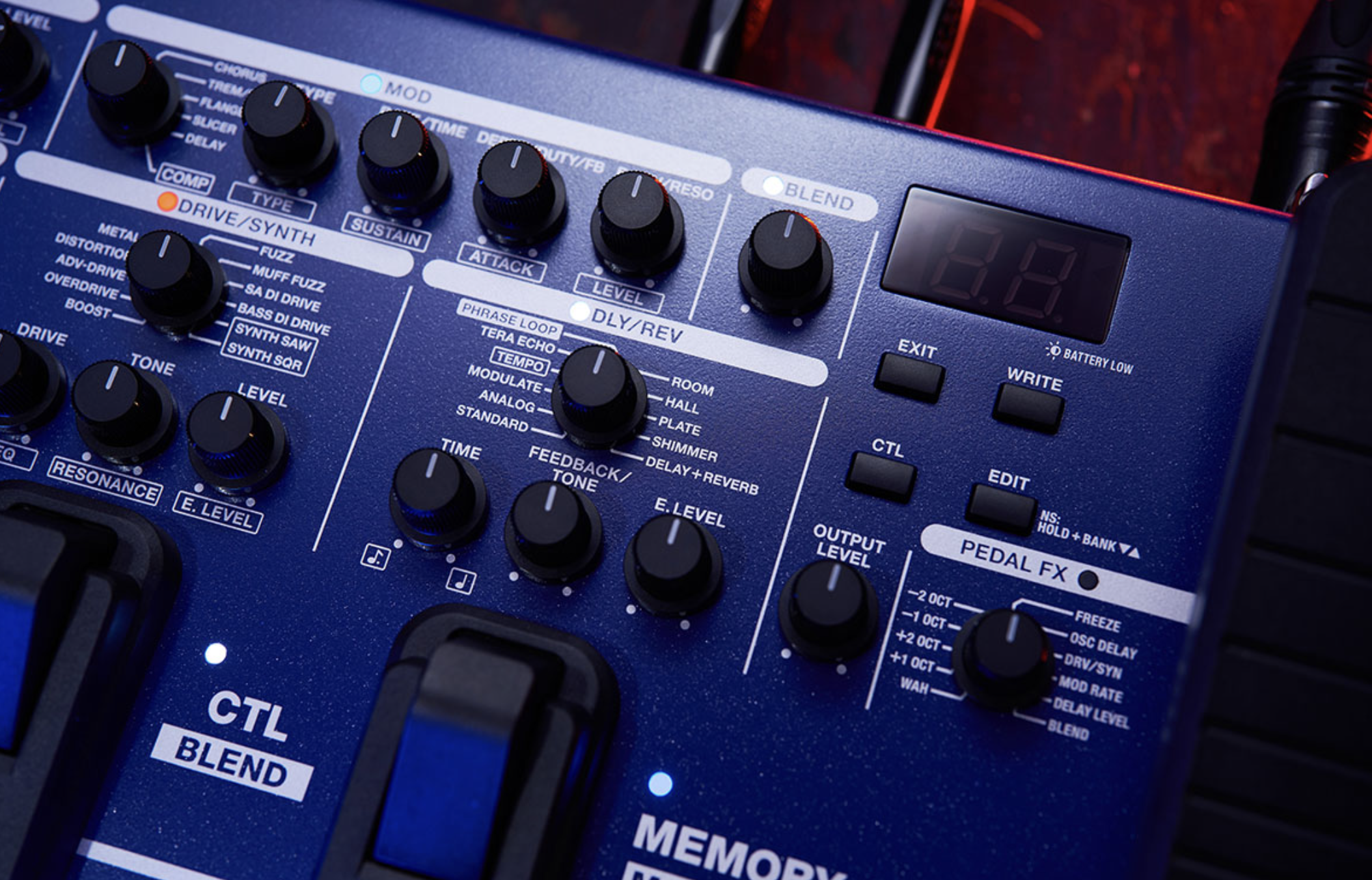 - Manual mode for pedalboard-style operation and Memory mode for switching complete setups