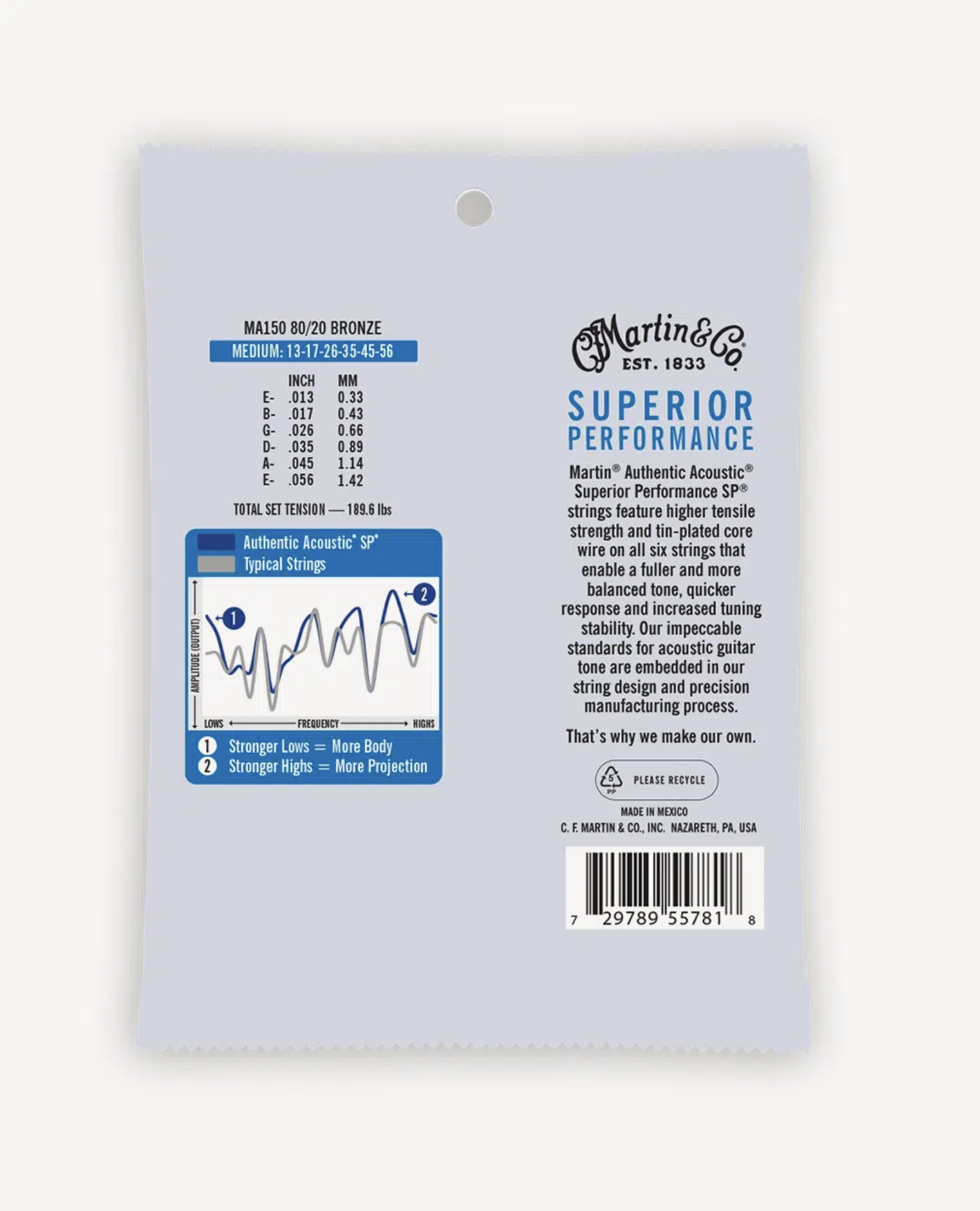 MA150 Authentic Acoustic SP er designet af C.F. Martin & Co. for at give overlegen tone til din akustiske guitar. Strengene er bygget op omkring en kernetråd med høj brudstyrke, der – sammen med en omviklingstråd af højeste kvalitet – sikrer stemmestabilitet og uovertruffen tone. Sættet her er omviklet med 80/20 Bronze, der giver en lys og sprød klang.