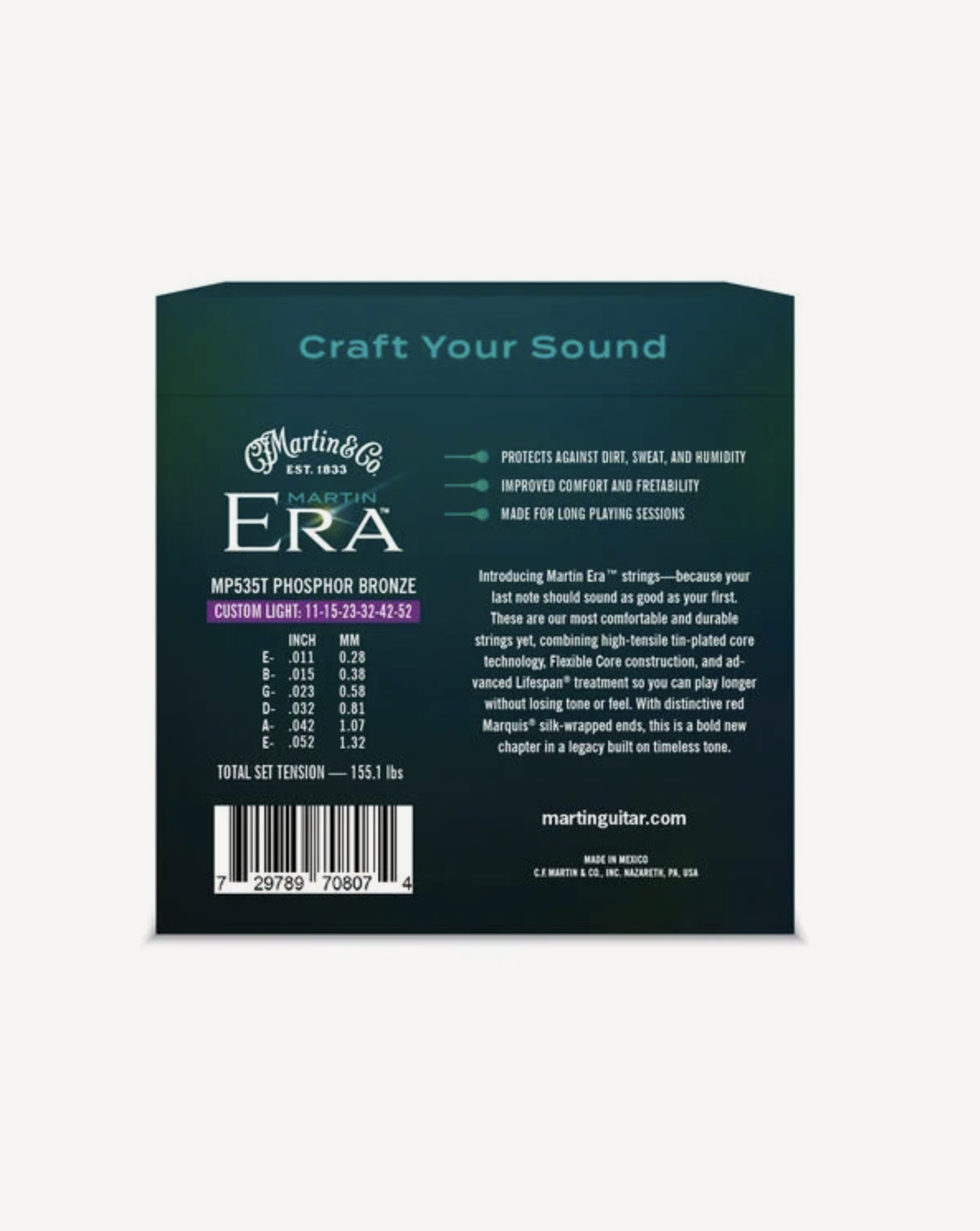 Martin Era-strengene er udviklet til at give guitaristen uovertruffen tone og spilbarhed, og de sætter en ny standard for, hvad en fosforbronze-akustisk guitarstreng kan være. Martin Era-strengene kombinerer de bedste teknologier, som Martin anvender i fremstillingen af strenge, med Lifespan-coating, der beskytter mod korrosion, en fleksibel Core-kernekonstruktion, der forbedrer spilbarhed og komfort, samt silkeindpakkede kugleender. Tykkelser: .012, .016, .025, .032, .042, .054