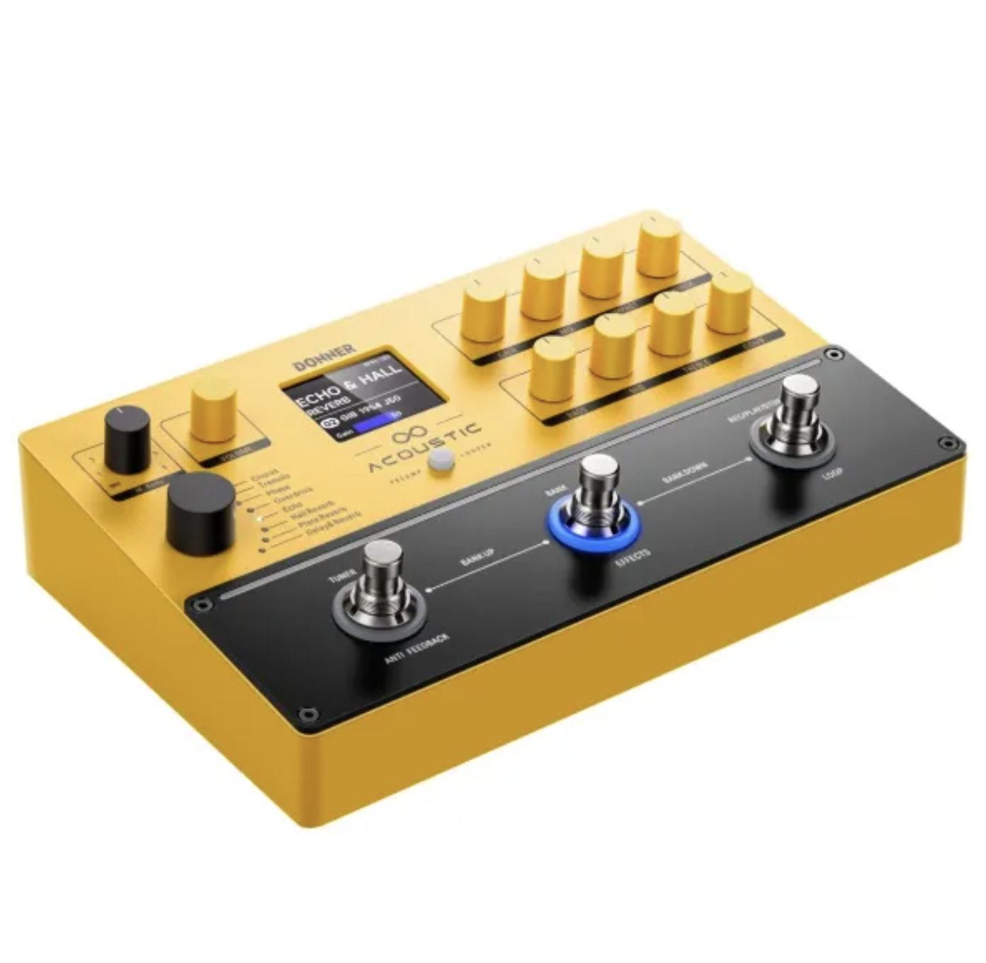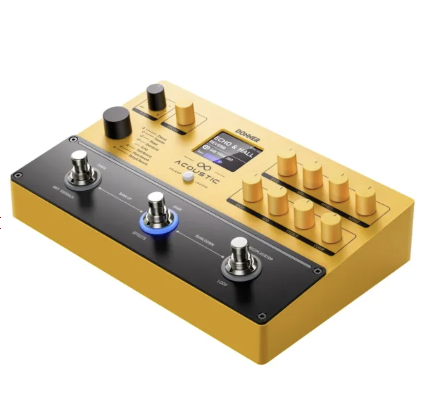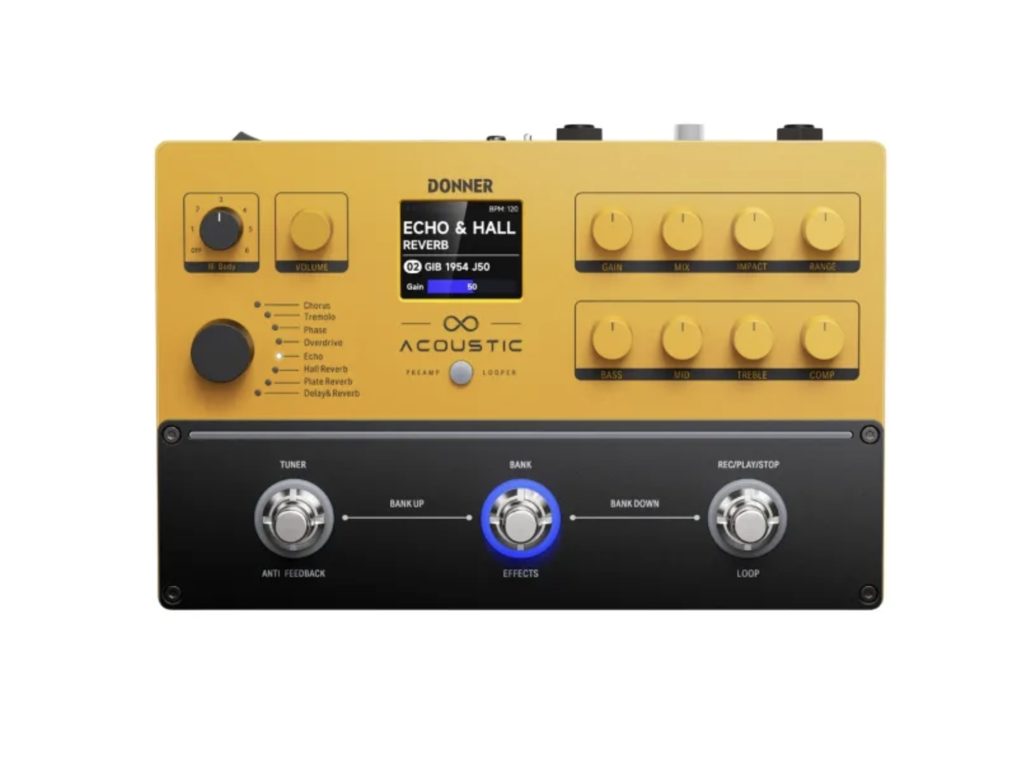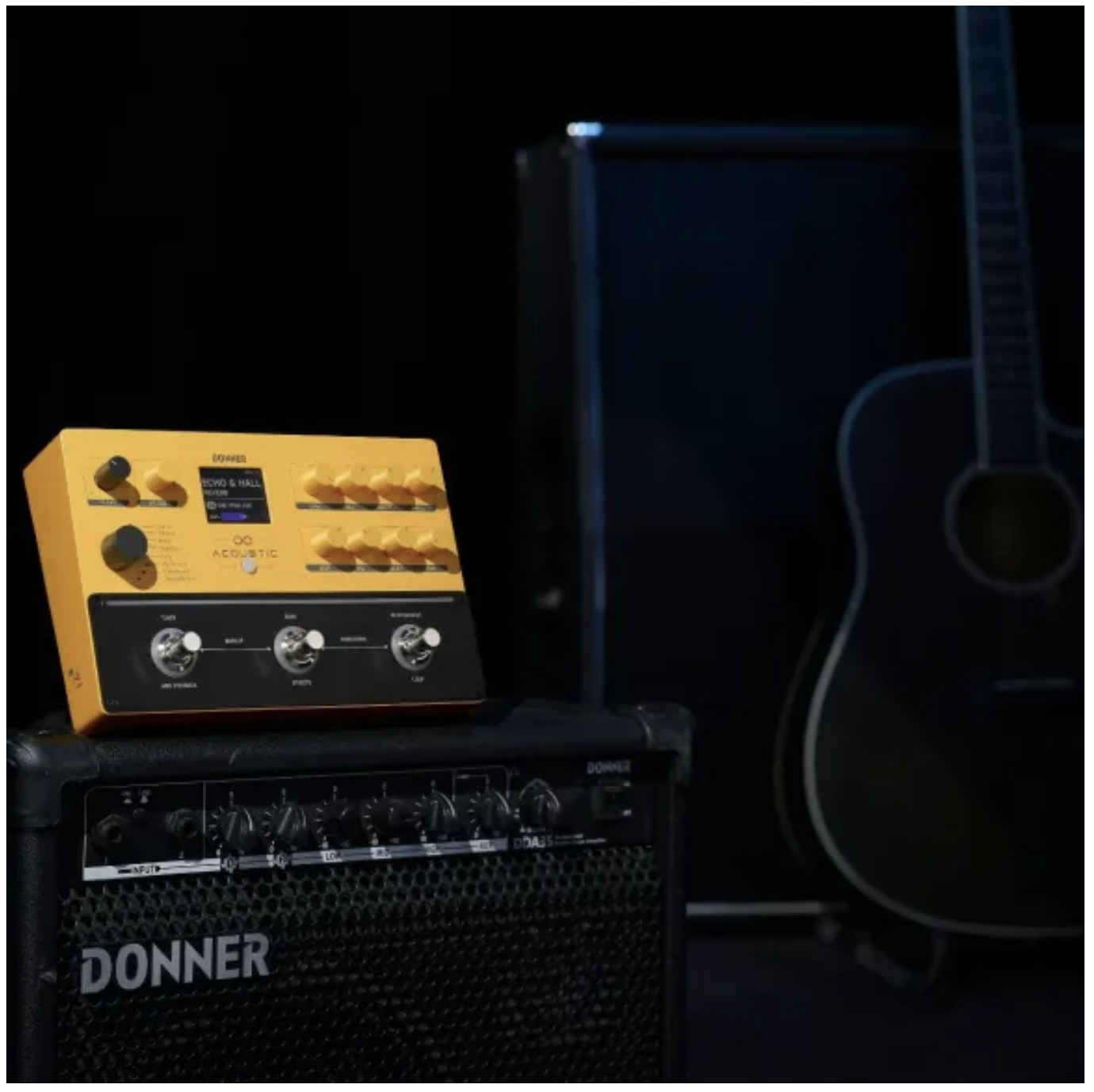 Donner Acoustic Preamp Loop er et kraftfuldt værktøj til den akustiske guitarist, der ønsker en komplet løsning til både lydformning, effekter og loop-optagelse – uanset om du øver, indspiller eller optræder live. Den kombinerer preamp, IR-simulation, effekter og looper i ét kompakt og brugervenligt format.