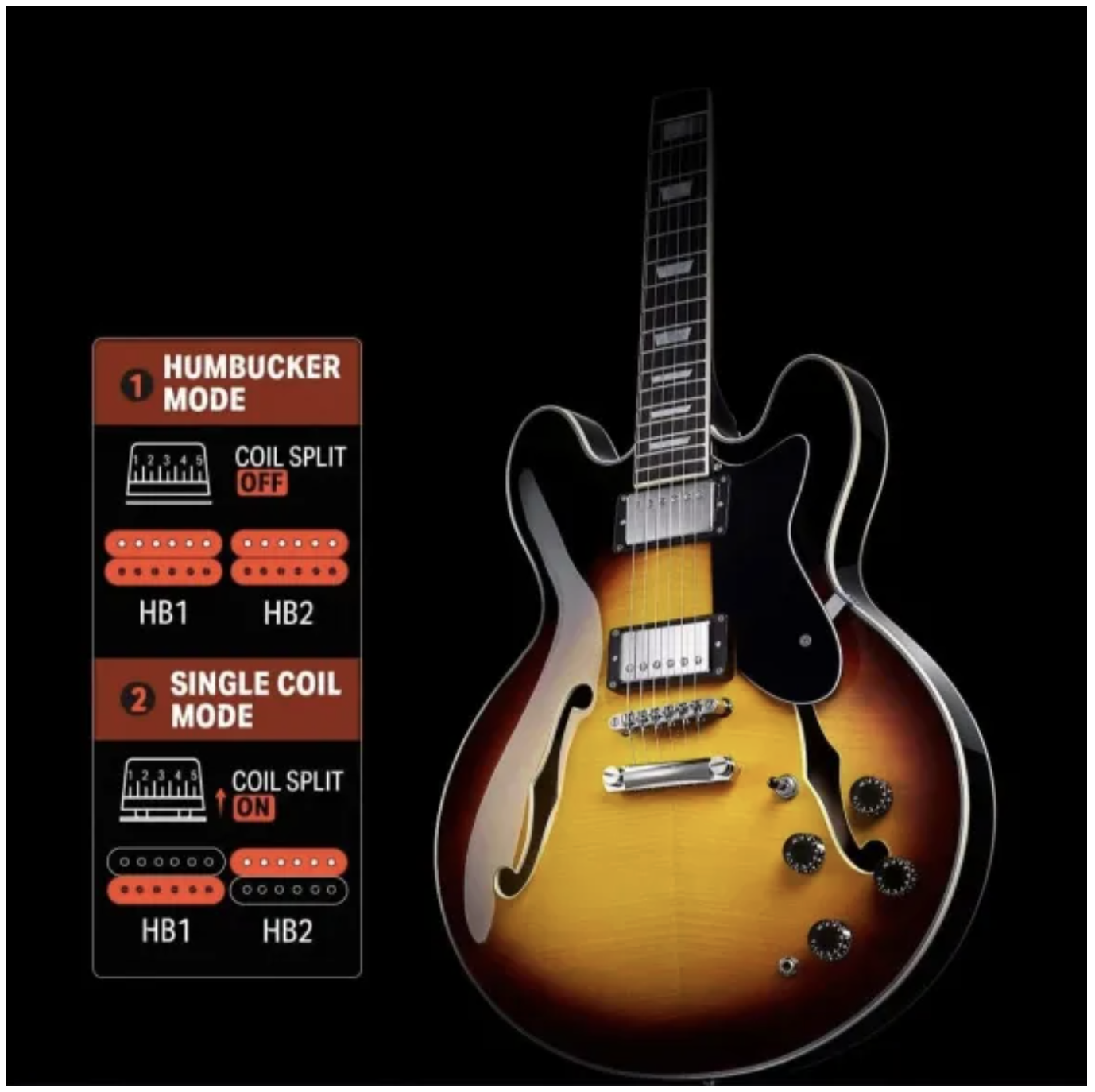 Guitarens to humbuckere leverer klassiske, varme toner med dybde og punch. Den indbyggede coil split-funktion (push/pull på tonekontrol) giver dig mulighed for at veksle til klarere single coil-lyde – ideelt til både rytmisk spil og jazzede melodier. Alt styres nemt via den 3-vejs pickupskifter.