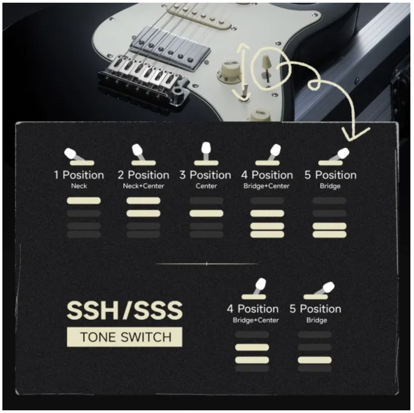 DST-550 Metallic Black er udstyret med et sæt ThunderForge keramiske pickupper i HSS-konfiguration. Du får en humbucker i bro-position og to single coils i midt og hals, som sammen giver alt fra rene, klare klange til fyldige, forvrængede soloer. Med coil split-funktionen kan du tilmed opnå klassiske single coil-lyde fra humbuckeren – perfekt til strat-inspirerede passager.