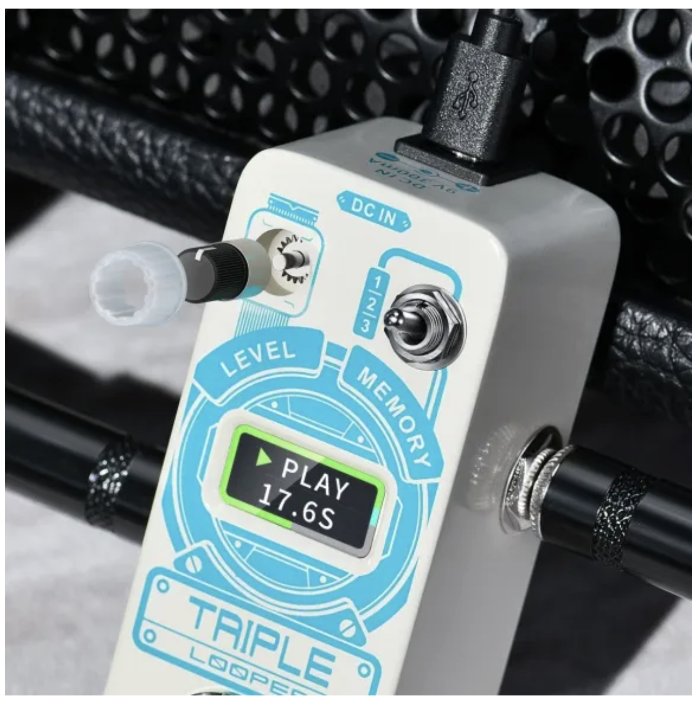 Triple Looper giver dig tre uafhængige hukommelsesspor, som hver kan gemme op til 30 minutters optagelse – med ubegrænset antal overdubs. Du kan altså gemme forskellige idéer, sange eller sektioner og nemt skifte mellem dem.