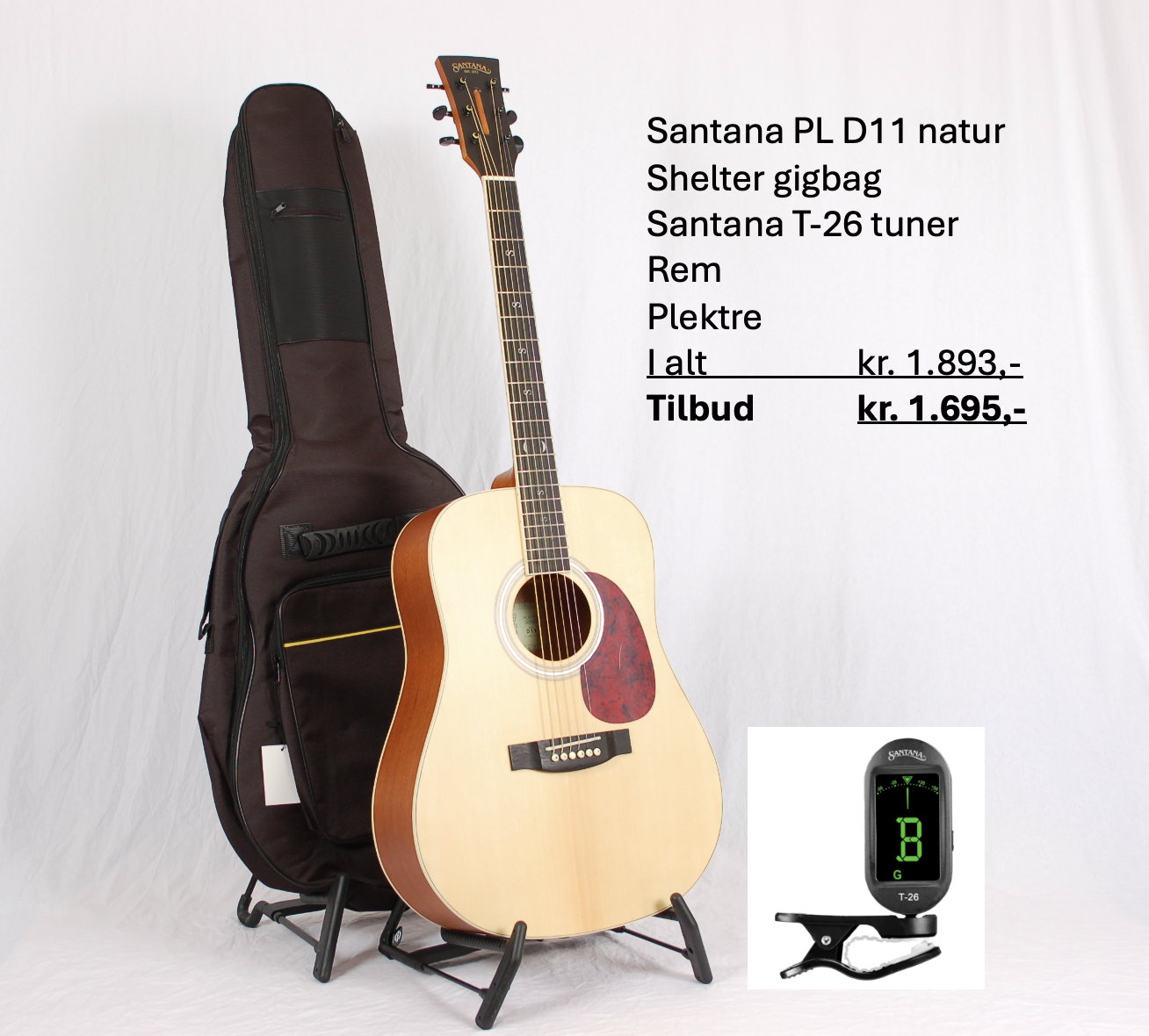 Her har jeg samlet et tjekket sæt med en Santana Player D11 westernguitar med gigbag, tuner, rem og plekter.